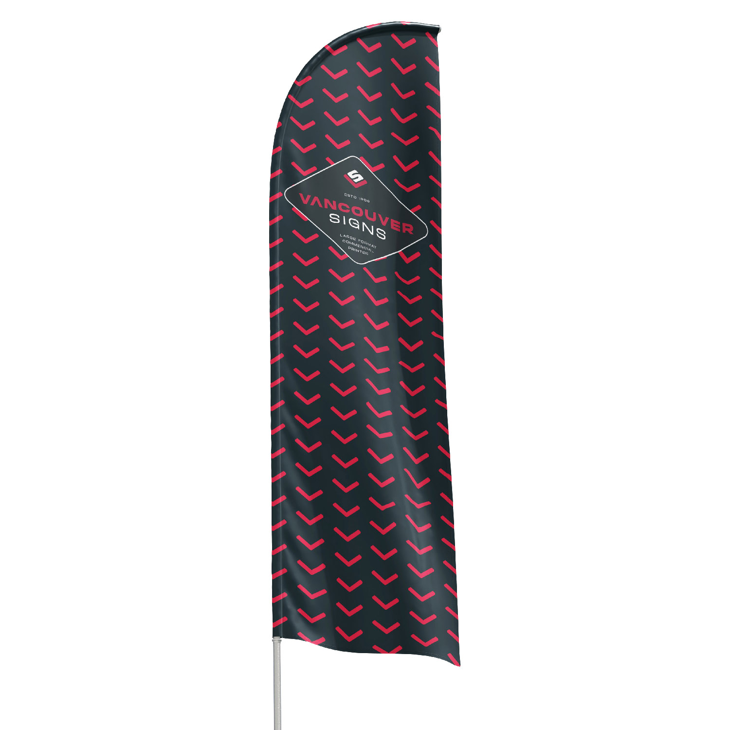 Feather flag with durable fiberglass pole. Lightweight, portable, and designed for indoor and outdoor promotions. Carrying bag included.